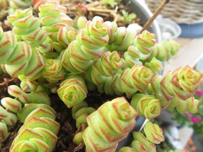 Es handelt sich um eine hängende Sorte, deren grüne Blätter in der Sonne rosa zu rot werden. Die Blätter scheinen übereinander gestapelt zu sein.