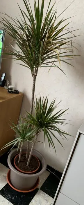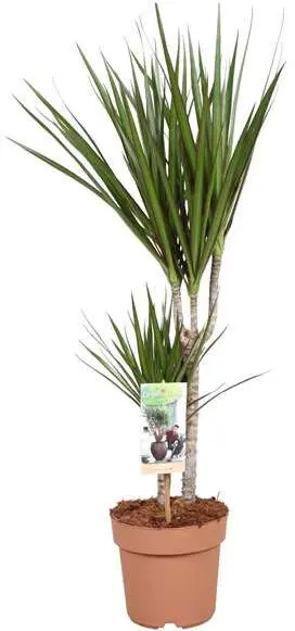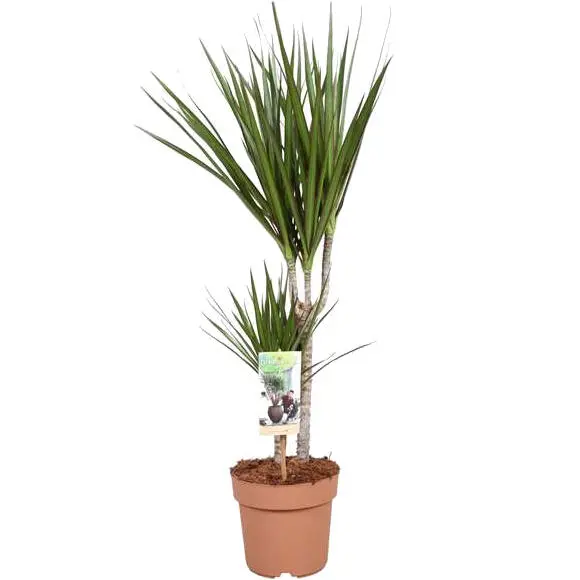Die bekannte Dracaena marginata ist eine sehr dekorative Pflanze fürs Wohnzimmer mit ihren langgestreckten, rotkantigen, grünen Blättern.