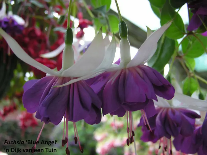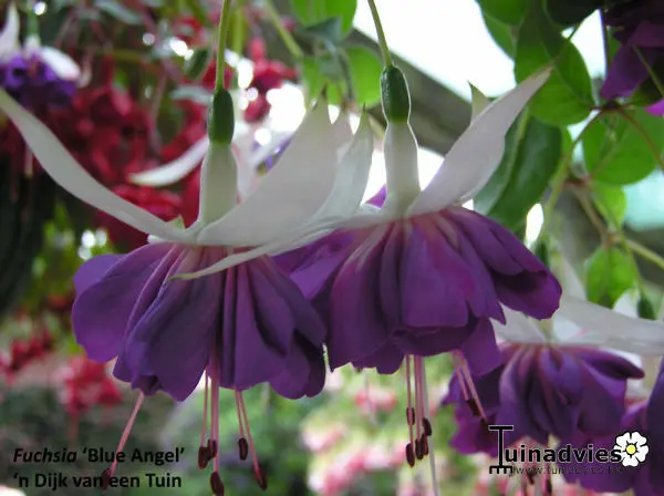 Fuchsia 'Blauer Engel' blüht mit hängenden großen Blüten, weißer Kelch mit lavendelblauer Doppelkrone.