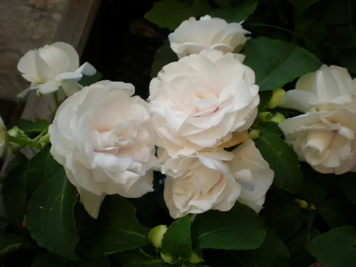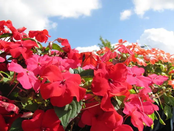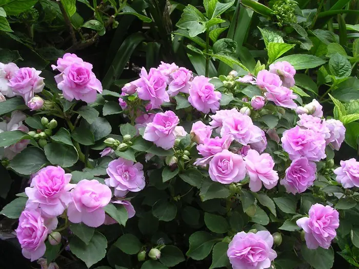 Die doppelblütige Industrious-Lilie blüht bis zum Frost und existiert in Weiß, Rosa, Rot, Orange, Flieder und mehrfarbig mit weißen Streifen.