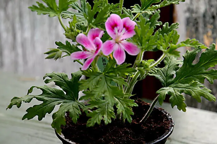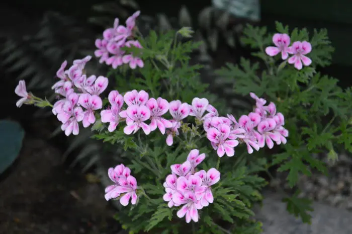 Pelargonium 'Lara Jester' blüht üppig mit halbdoppelten, rosa Blüten mit violetten Markierungen und weißen Augen.Die Blätter sind wunderschön tief eingeritzt und sehr aromatisch, riechen nach Rosen und Limette.