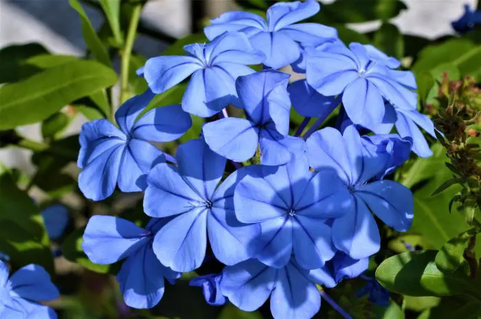 Plumbago blüht sehr früh im Frühling bis weit in den Herbst hinein mit phloxartigen, himmelblauen Blüten.