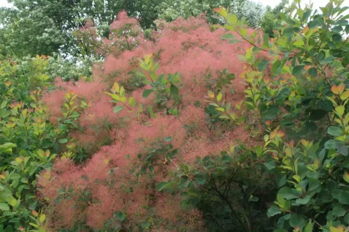 Cotinus, insbesondere Cotinus coggygria und die amerikanische Art Cotinus obovata, sind sehr dekorative Sträucher oder kleine Bäume mit einem buschigen Wuchs und ihrer spektakulären alten rosa federförmigen Blüte.