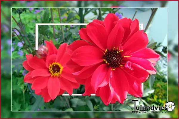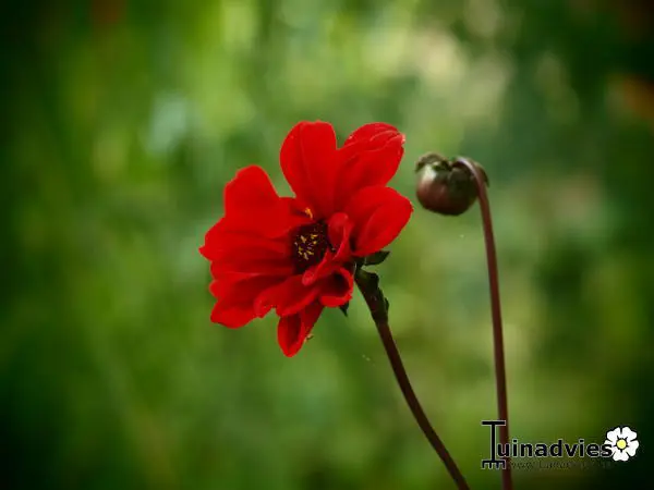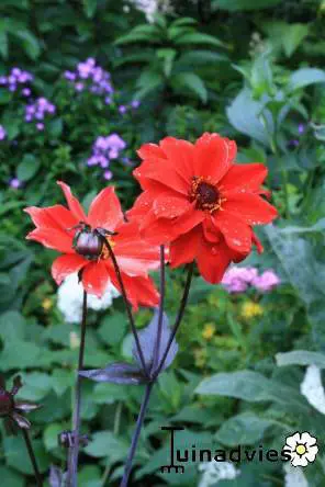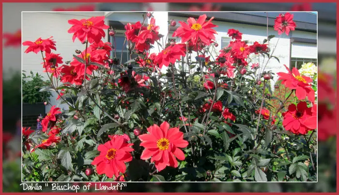 Dahlia 'Bischof von Llandaff' ist eine Pfingstrosenblüten-Dahlie. Die Blüten haben zwei bis fünf Windungen mit Blütenblättern, die ein offenes Herz umgeben.