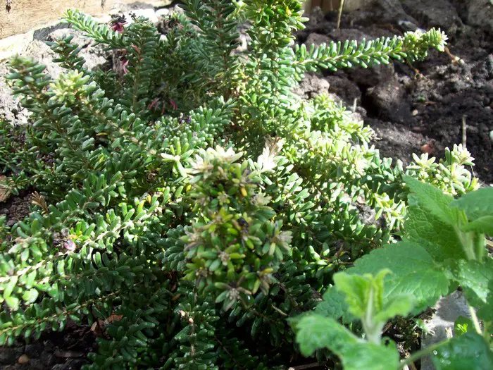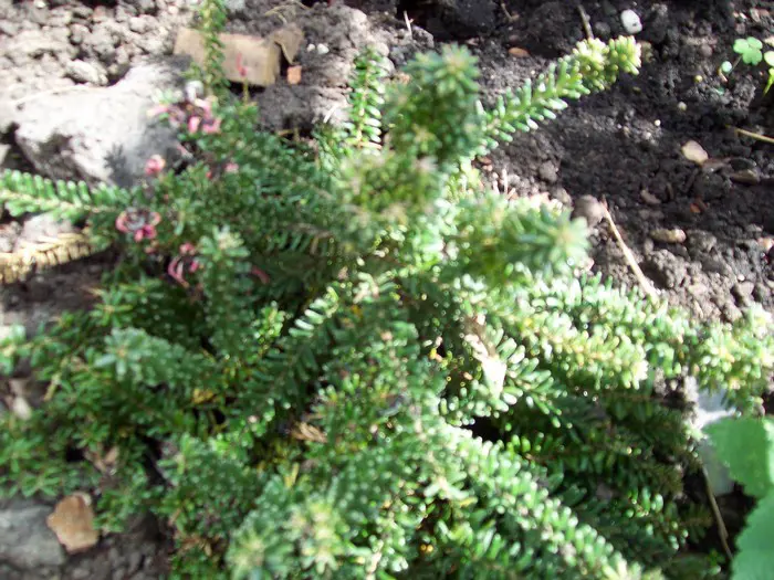 Es handelt sich um einen aufrechten, pyramidenförmigen Strauch mit dicken, nadelförmigen Blättern, der mit rosa-rot gelockten Blüten blüht.
