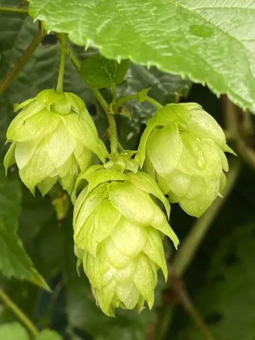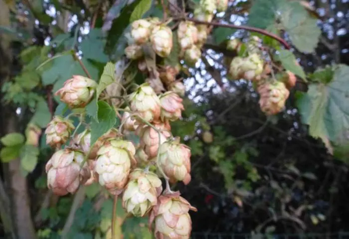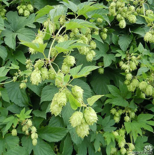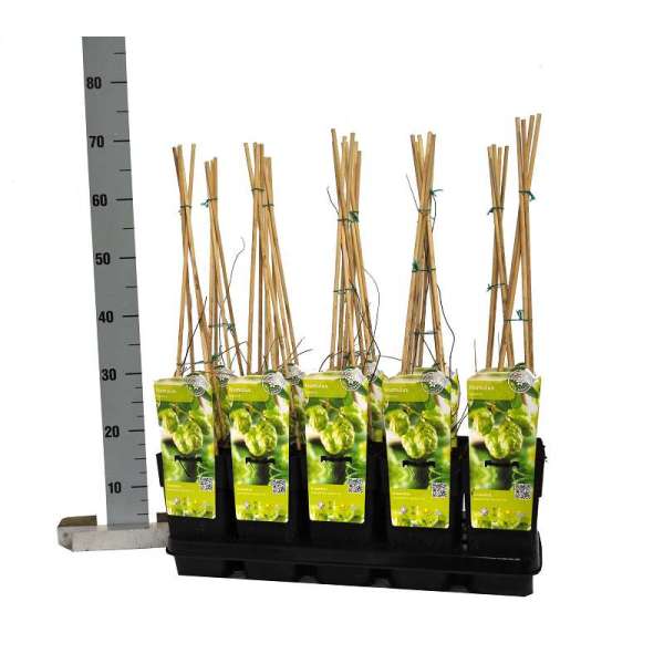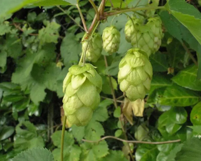 Die männliche Pflanze ist an der rispenförmigen hängenden Blume zu erkennen, die weibliche an der kurzstäbbeligen, zapfenförmigen Blüte.