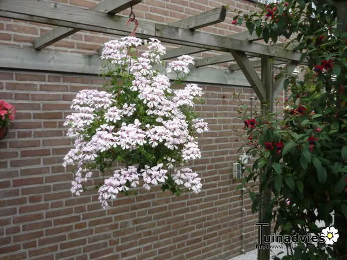 Pelargonium peltatum 'White Glacier' ist eine hängende Geranie mit sehr langen Ranken (70 cm).