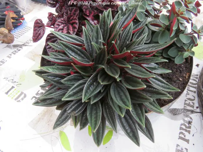 Peperomia caperata 'Rosso' ist eine Halbsukkulente und wird hier als Zimmerpflanze gehalten.