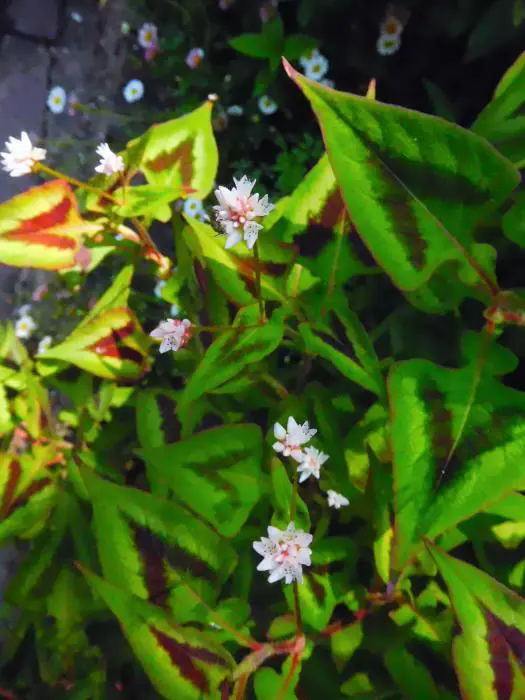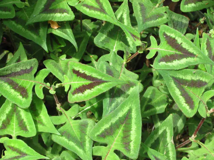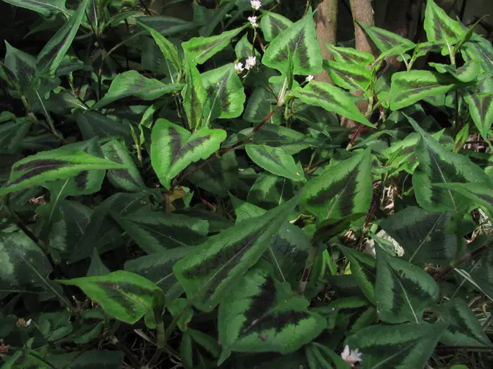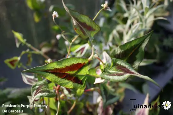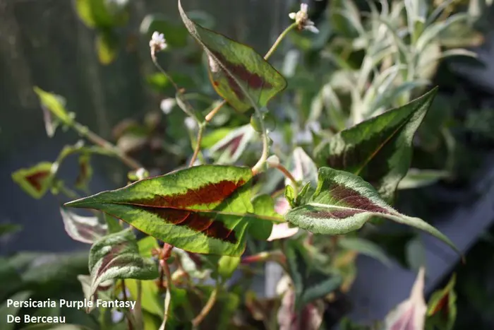 Persicaria microcephala 'Purple Fantasy' hat auffällige grüne Blätter an tiefroten Stängeln mit einem dreieckigen violetten und silbernen V-Zeichen in der Mitte. Im Herbst verwandelt sich das Grün in einen violetten Farbton.