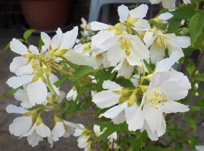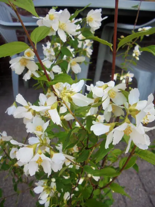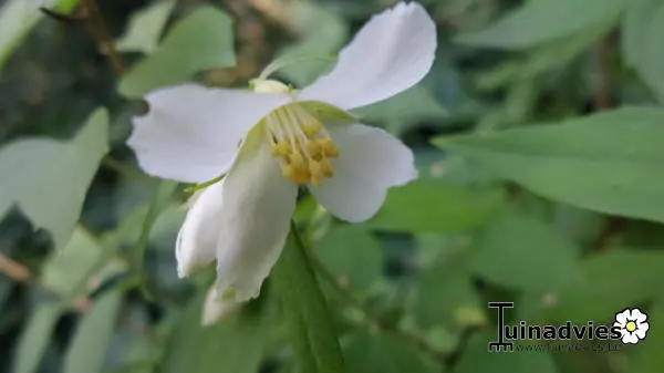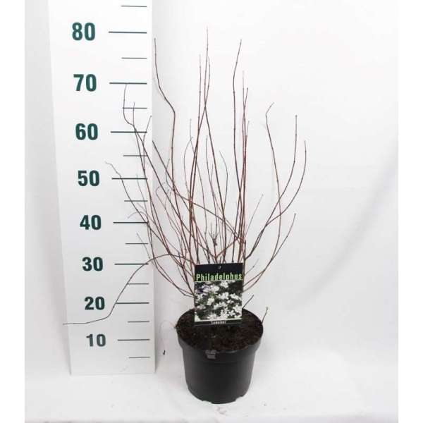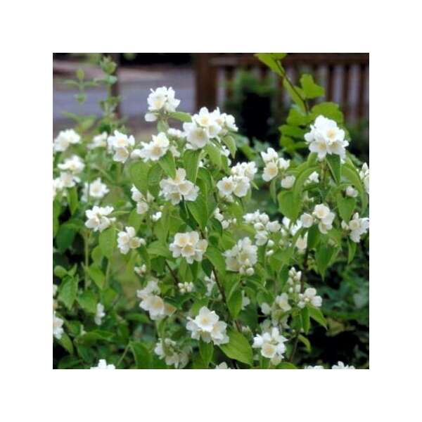 Philadelphus 'Lemoinei' ist ein breit wachsender, dichter, aufrechter Strauch mit hellgrünen Blättern.