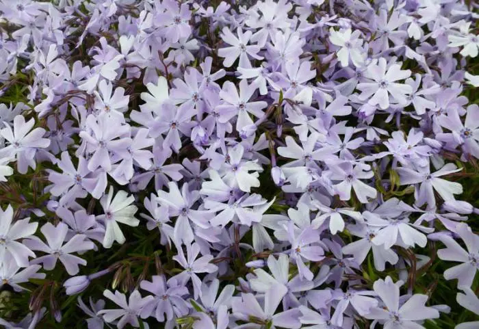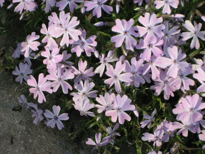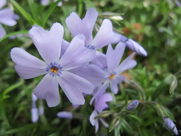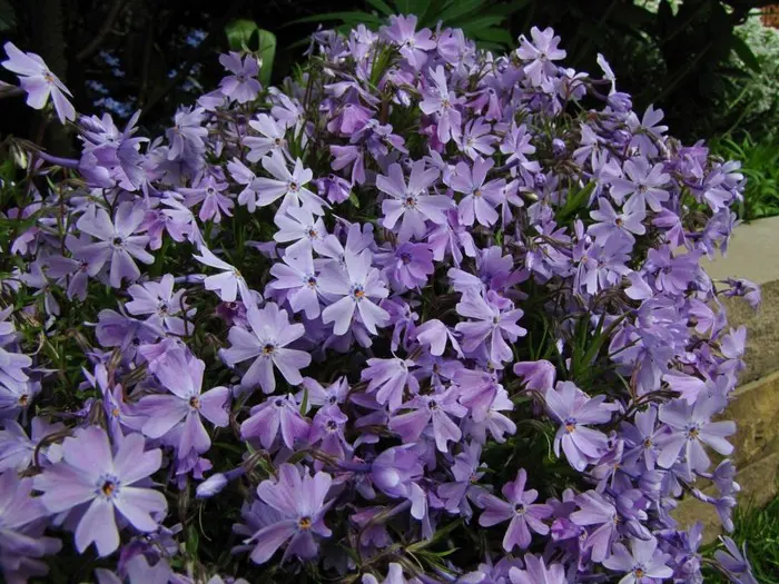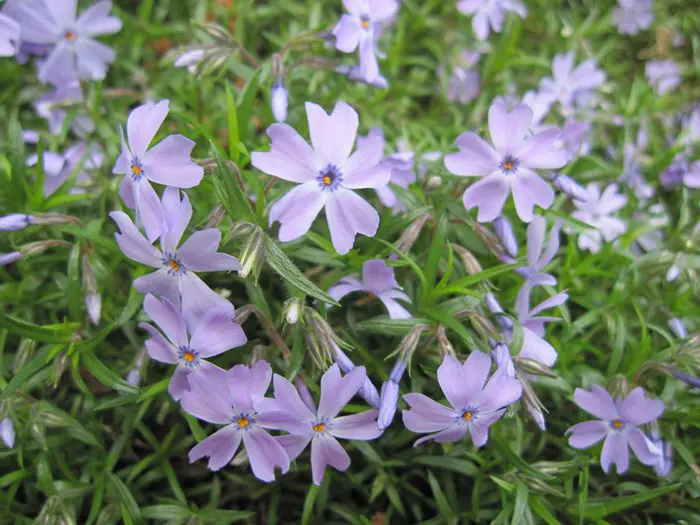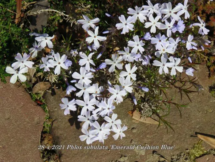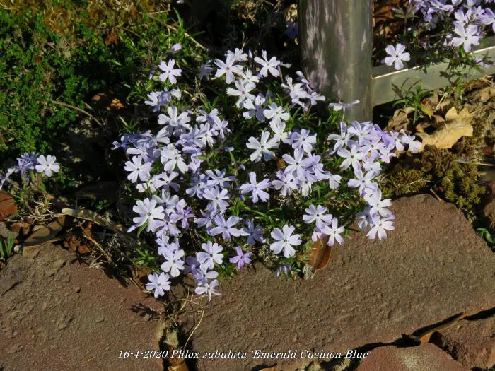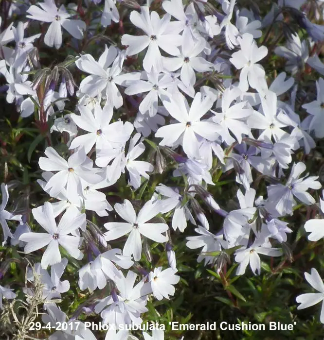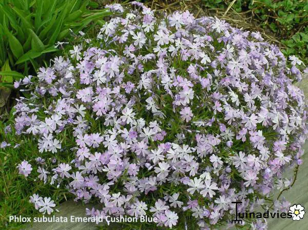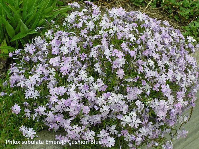 Phlox subulata 'Emerald Cushion Blue' ist ein immergrüner Bodendecker mit kleinen violettblauen Blüten in Büscheln.
