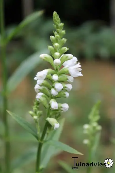 Physostegia virginiana 'Summer Snow' ist eine aufrechte, buschige Staude mit schmalen, lanzettförmigen, dunkelgrünen Blättern.