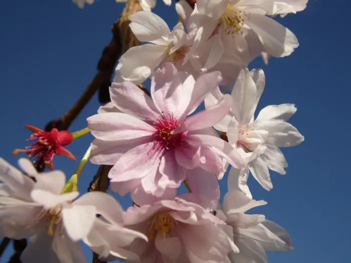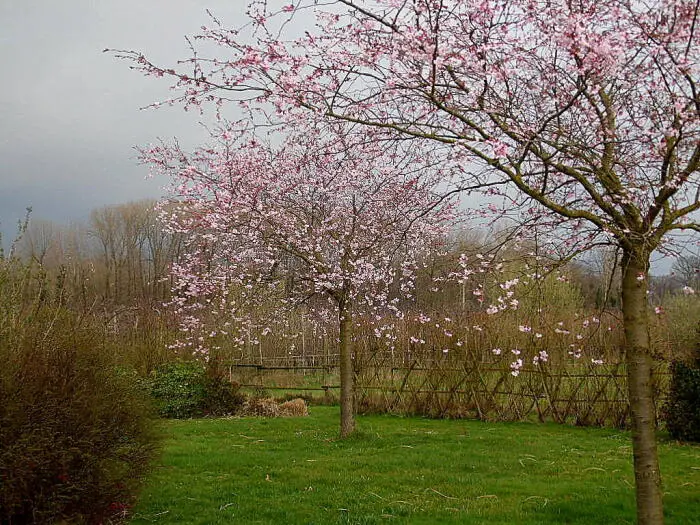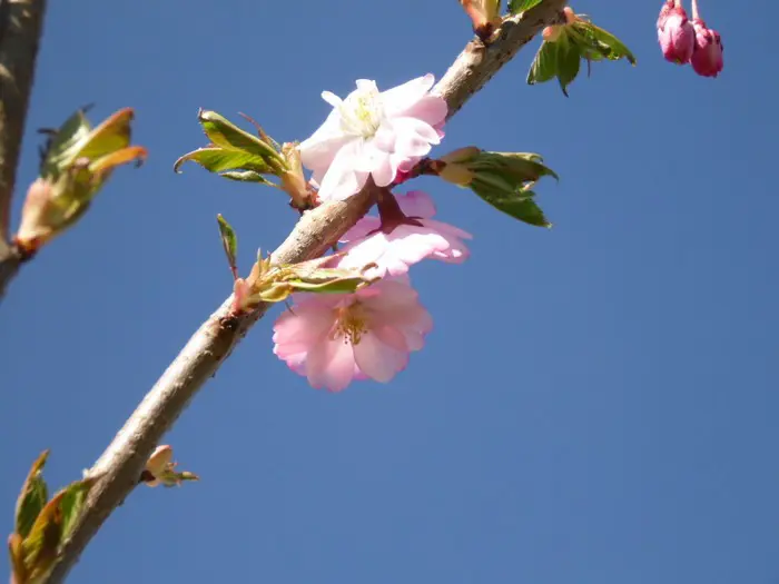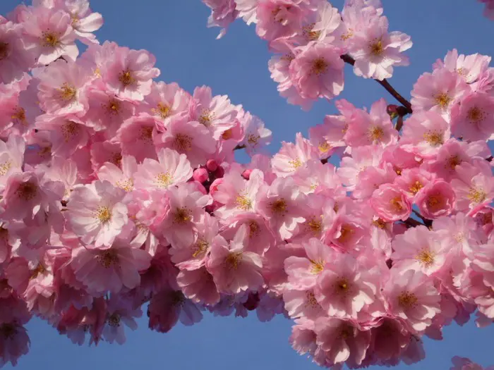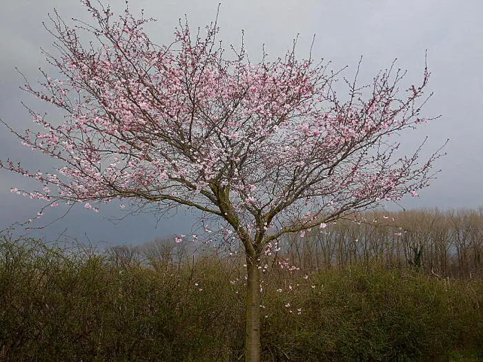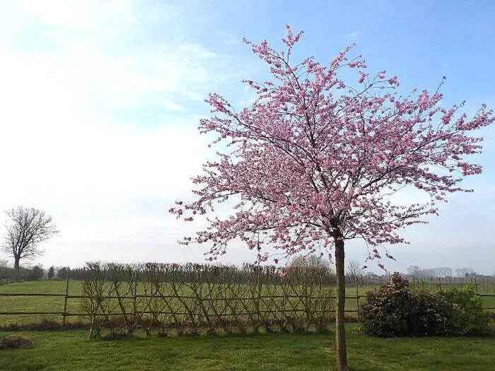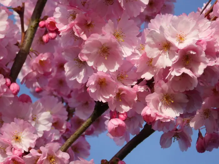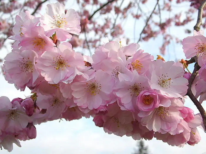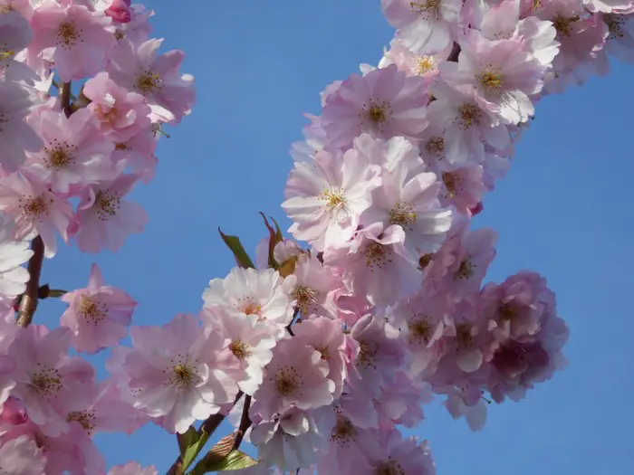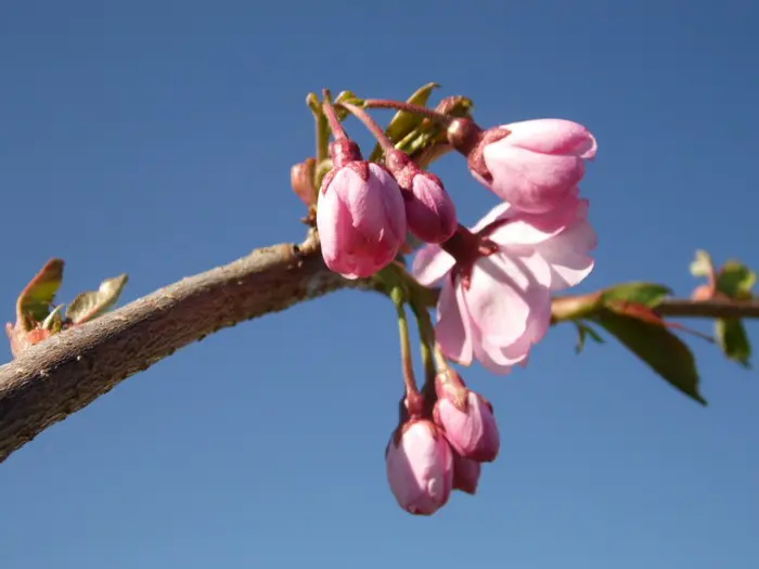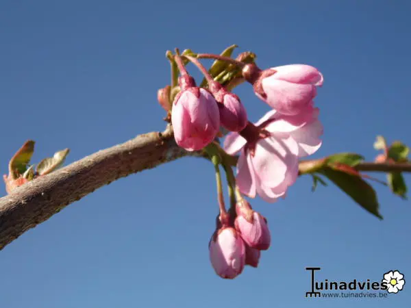 Es ist eine der schönsten Zierkirschen mit hängenden Büscheln halbdoppelter rosa Blüten. Blühen drei Wochen lang zwischen März und April.