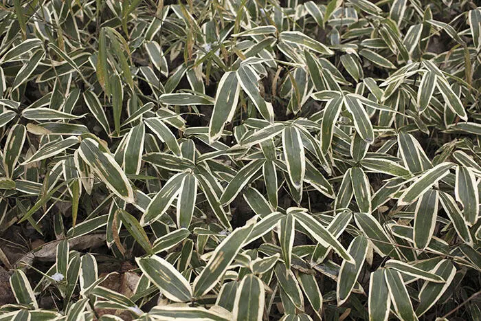 Eine niedrige Bambusart mit auffälligen, anmutigen, breiten Blättern, dunkelgrün und glänzend, die gegen den Herbst weiße Ränder bekommt.
