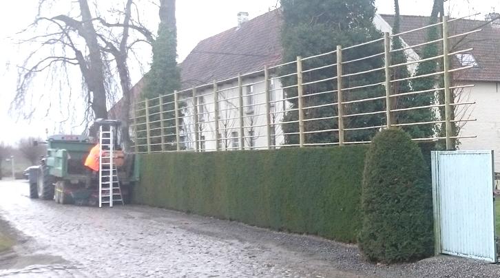Sie alle haben ein paar Gemeinsamkeiten. Vor dem Pflanzen ist es notwendig, eine stabile Struktur zu schaffen, entlang der Sie die Hauptzweige der jungen Bäume führen können. Die Struktur besteht aus robusten Kiefernholzpfählen, die tief genug im Boden verankert sind. Diese Stangen sind wiederum durch Drähte oder Bambusstäbe miteinander verbunden. Das geschieht auf verschiedenen Etagen oder 'Stockwerken', je nach der gewünschten Höhe. Der Abstand zwischen den Pfosten beträgt üblicherweise 3 Meter, zwischen den Stockwerken verwenden wir einen Abstand von etwa 30 cm. Sie können die Bäume auch im Voraus kaufen, mit anderen Worten, mit einem Bambusrahmen, der in der Baumwipfel montiert ist.