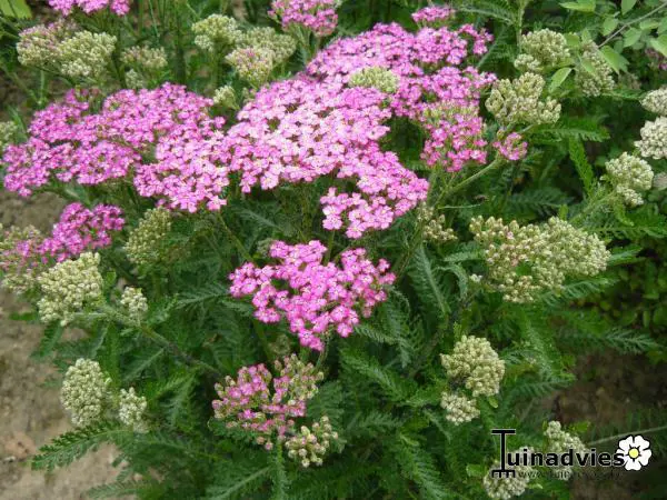 Achillea millefolium 'Pretty Belinda' ist eine kompakt wachsende, gut verzweigte Sorte mit flachen, leuchtend roten bis leuchtend korallenfarbenen Blüten.