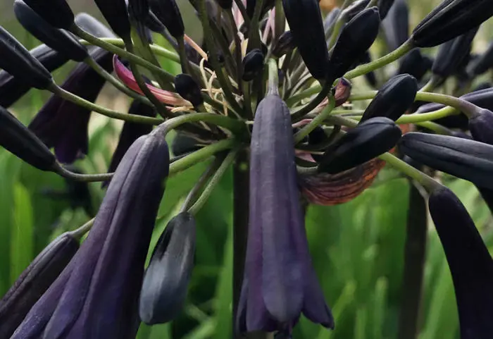 Agapanthus 'Black Magic' hat gürtelförmige Blätter und blüht üppig mit runden Dolben aus trompetenförmigen, indigoblauen Blüten an kräftigen Stängeln. Es ist die dunkelste, die bisher gefunden wurde.