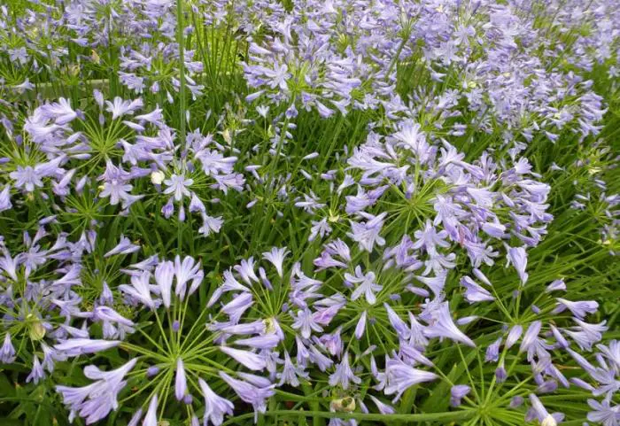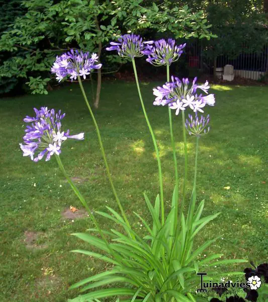 Agapanthus 'Dr Brouwer' (Trompetengruppe) hat gürtelförmige Blätter und blüht üppig mit runden Dolden aus trompetenförmigen, violettgestreiften azurblauen Blüten auf kräftigen grünen Stängeln.