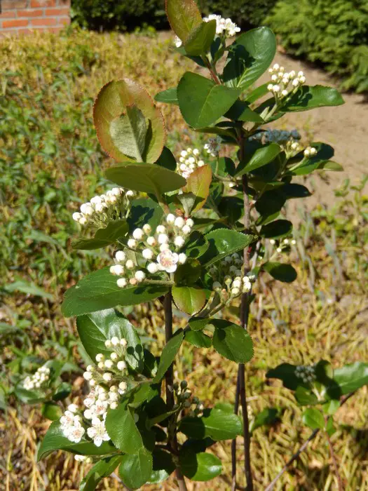 Aronia melanocarpa 'Viking' ist eine sehr empfohlene Sorte, ein Klon, der für Blüten- und Beerenproduktion ausgewählt wurde. Es handelt sich um einen kompakt wachsenden Strauch mit sehr reicher Blüte.