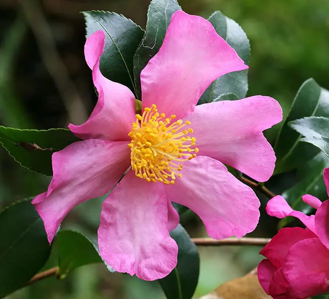 Camellia sasanqua blüht bereits im Oktober/November mit weißen oder rosa, einzelnen Blüten.