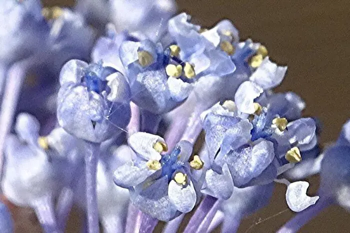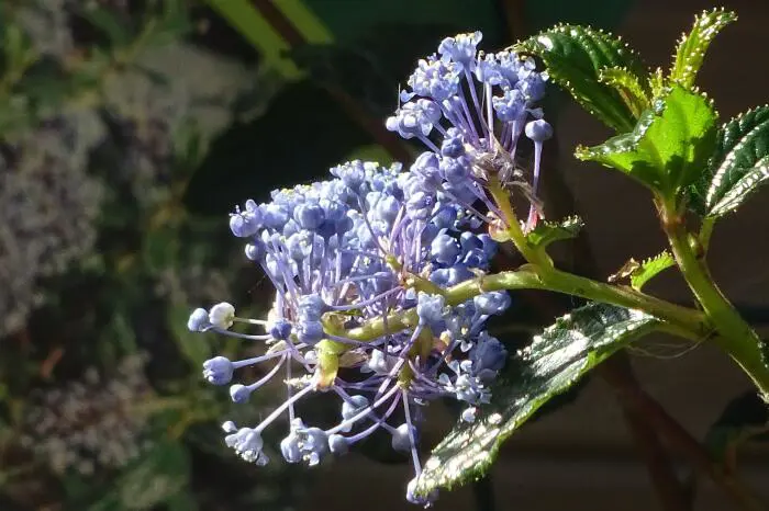 Ceanothus 'Burkwoodii' zeichnet sich durch seine lange Sommerblüte aus, die für einen Ceanothus eher selten ist. Blüht reichlich mit mauvefarbenen blauen Blütenrispen.