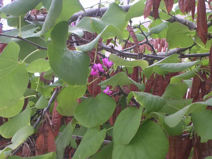 Cercis siliquastrum ist ein oft mehrstämmiger, kleiner buschiger Baum mit herzförmigen, blaugrünen Blättern und violett-rosa Blüten, gefolgt von purpurfarbenen Schoten.