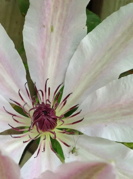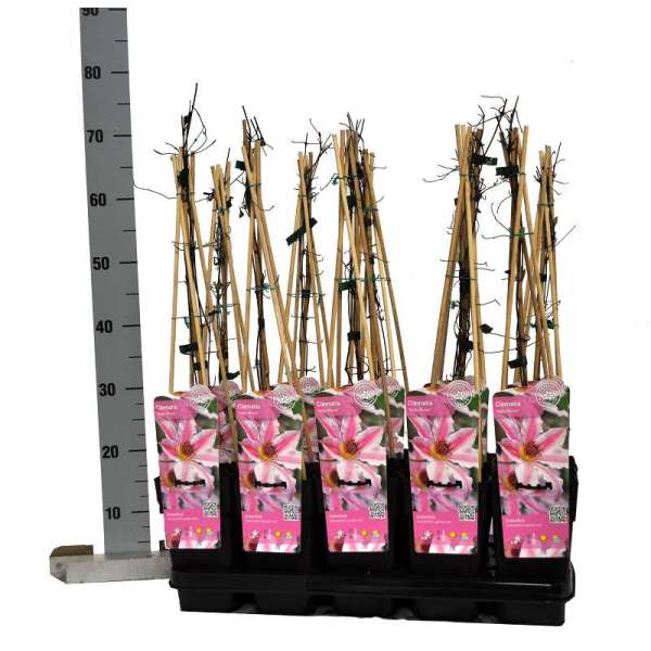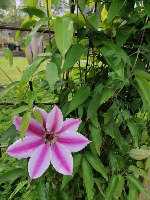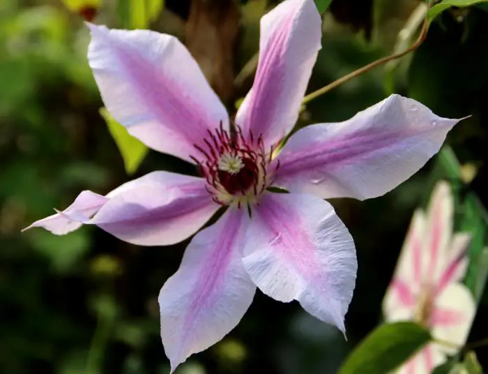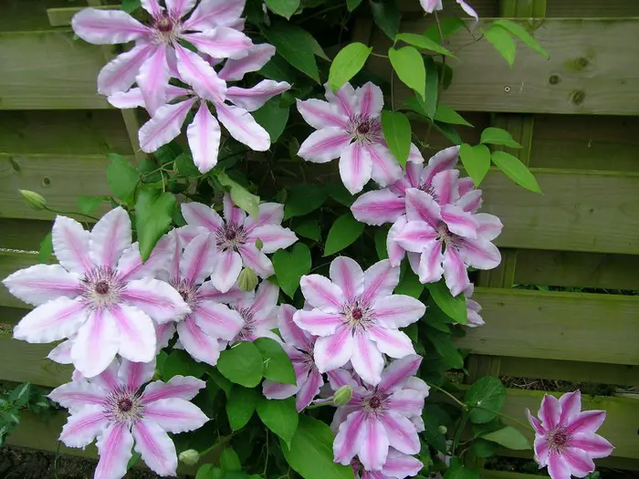 Clematis 'Nelly Moser' ist eine frühe großblühende Pflanze aus der Lanuginosa-Gruppe mit hellviolett-rosa Blüten, die weiß werden.