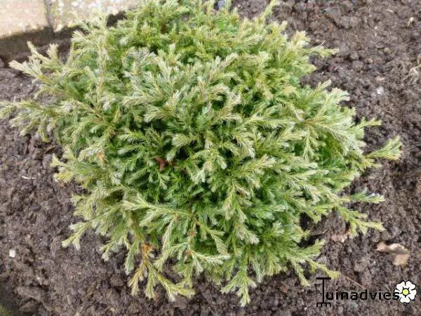 Chamaecyparis pisifera 'Baby Blue' ist ein Zwergnadelbaum mit blau-grüner Farbe.