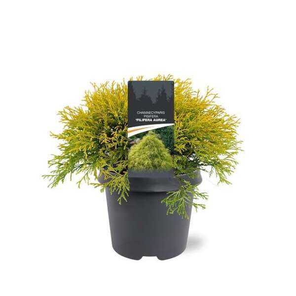 Chamaecyparis pisifera 'Filifera Aurea' bildet einen runden Strauch mit langen, dünnen, herabhängenden gelben Zweigen.