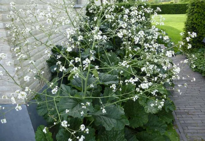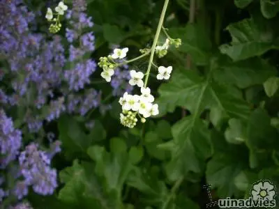 Crambe cordifolia ist eine imposante, aber luftige Pflanze, die zunächst große graugrüne, dicke, fleischige Basisblätter von 70 cm Höhe bildet, die mühelos 1 m² bedecken.