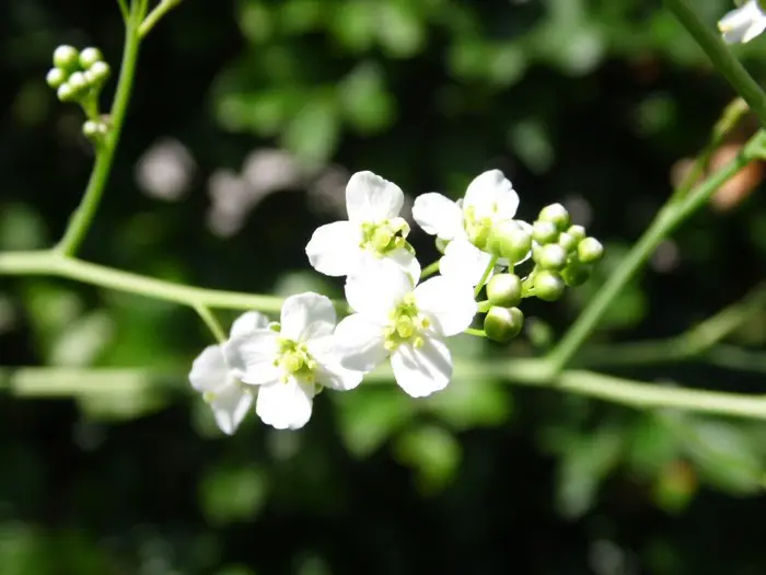 Im Mai erscheinen lange Stängel von bis zu 2 m Höhe mit einer Wolke sehr kleiner, feiner weißer Blüten, die Gypsophilla/Gypsophila ähneln. Die Blumen haben einen süßen Honigduft.