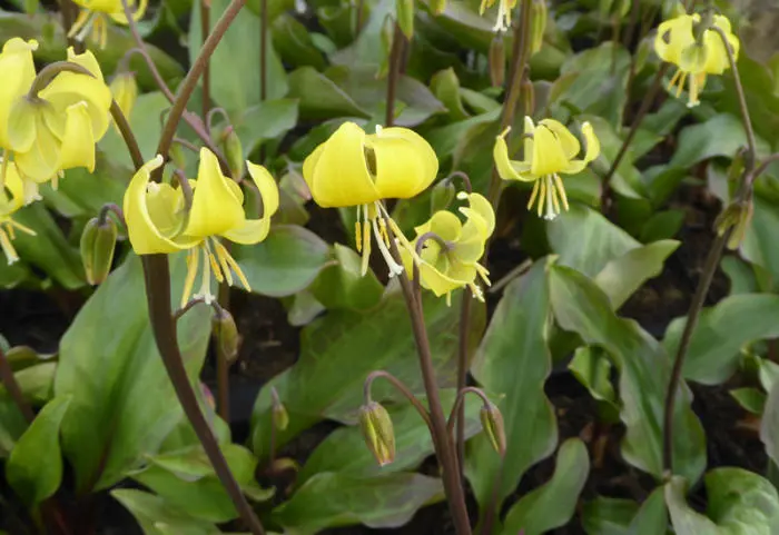 Erythronium 'Pagoda' bildet im Frühling braune Blütenstängel mit 5 bis 6 großen Lilien mit gebogenen, goldgelben Blütenblättern.
