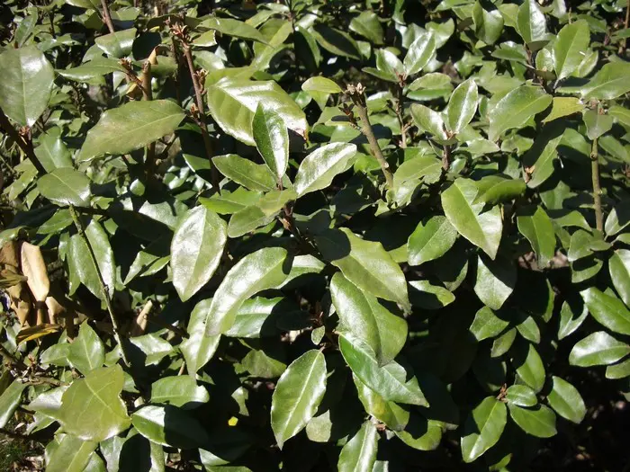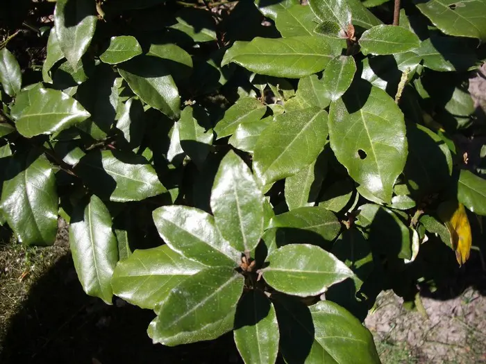Die Blattform des Elaeagnus x ebbingei ähnelt der des Olivenbaums, große, glänzende, ledrige ovale Blätter mit grauer Unterseite.