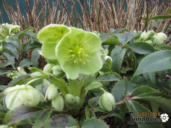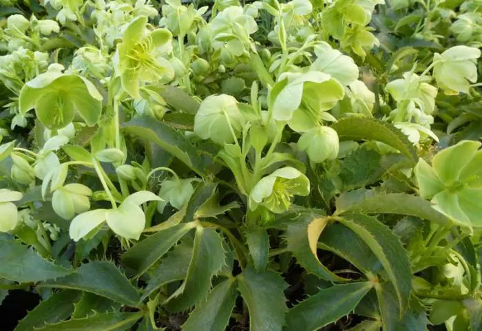 Helleborus argutifolius unterscheidet sich von den anderen Niewurrosen durch ihre graugrünen, rauzahnigen Blätter und Blüten mit Dolden aus grünlich-gelben, becherförmigen Blüten.