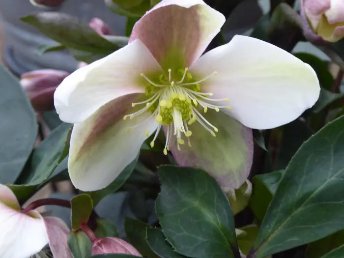 Helleborus x ericsmithii VIV 'Valeria' ist eine kompakt wachsende Pflanze mit frisch grünen Blättern und großen, cremeweißen Blüten aus rosa Knospen. Während die Blüten blühen, nehmen ihre Blütenblätter subtile rosa und grüne Farbtöne an, die einen schönen Kontrast zu den feinen blassgelben Staubblättern bilden.