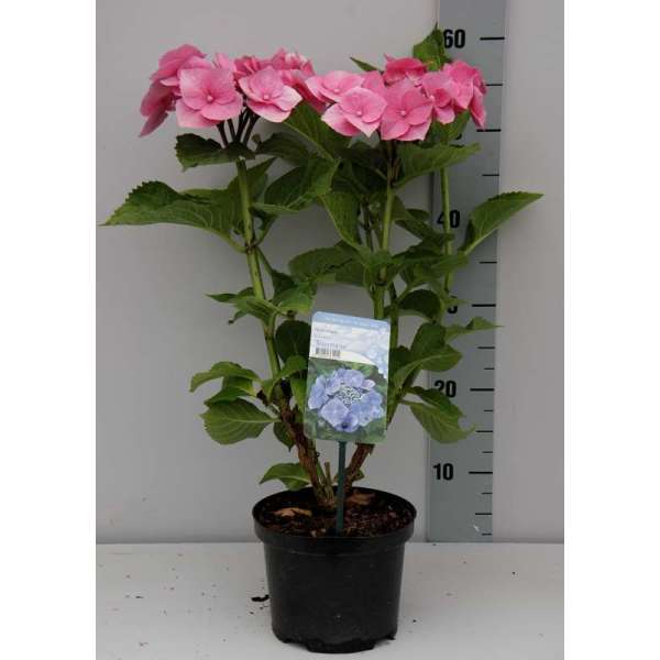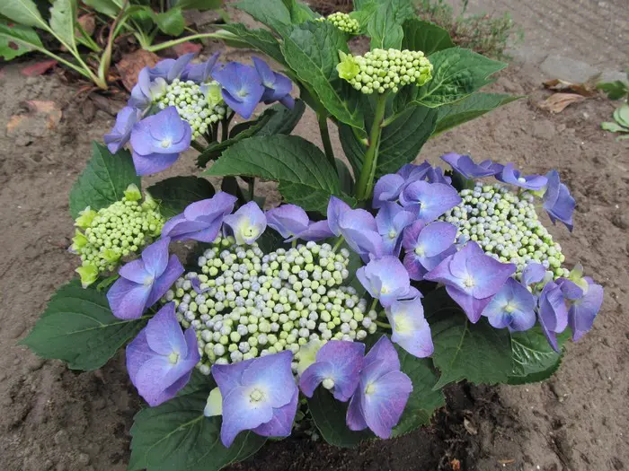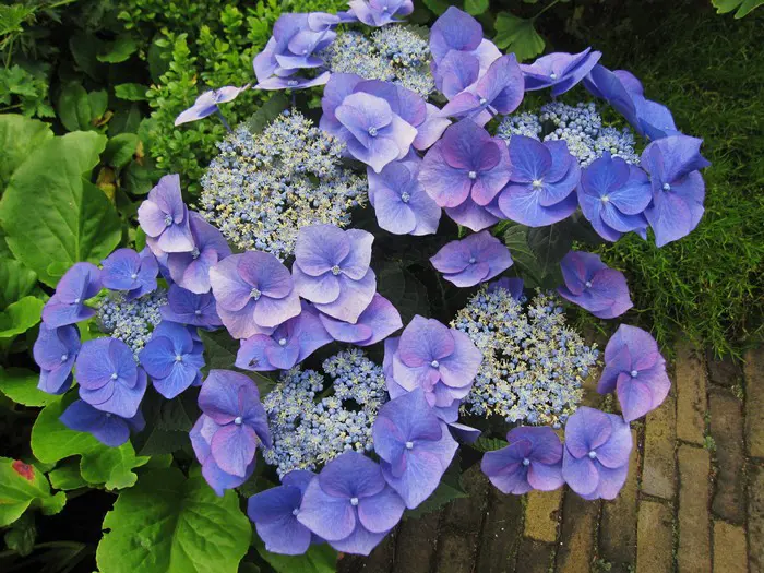 Hydrangea macrophylla 'Blaumeise' ist intensiv blau, die fruchtbaren Blüten sogar noch fruchtbarer als die Randblüten.