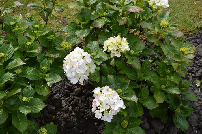 Hydrangea macrophylla 'Nymphe' blüht mit kugelförmigen weißen Blüten.