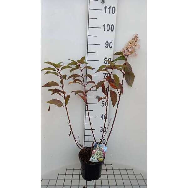 Hydrangea paniculata 'Candlelight' ist ein kompakter Strauch mit roten Zweigen, auf dem spitze weiße Corymbs blühen. Später im Sommer werden die Blüten cremegelb.