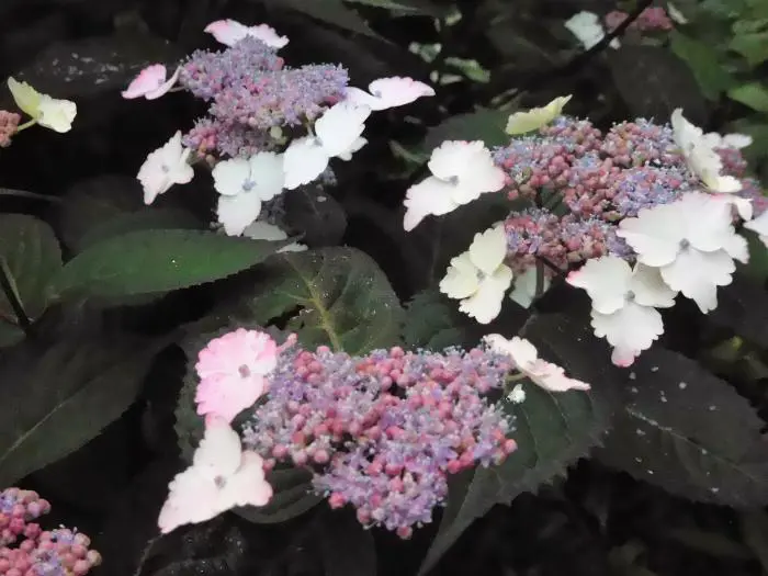 Hydrangea serrata 'Intermedia' hat flache, umbelförmige Blüten. Bloom weiß wird rosa oder hellblau. Die Säure und das Aluminium im Boden oder in der Behandlung mit Aluminium lassen sie blau färben.