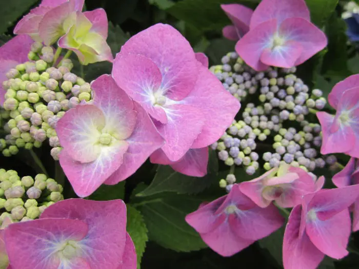 Hydrangea serrata Veerle ist eine Umbellifer-Hortensie mit azurblauen, sterilen Blüten (oder rosa, je nach Säure des Bodens) und rosa-violetten bis hellvioletten, fruchtbaren Randblüten.