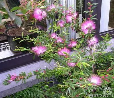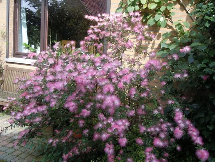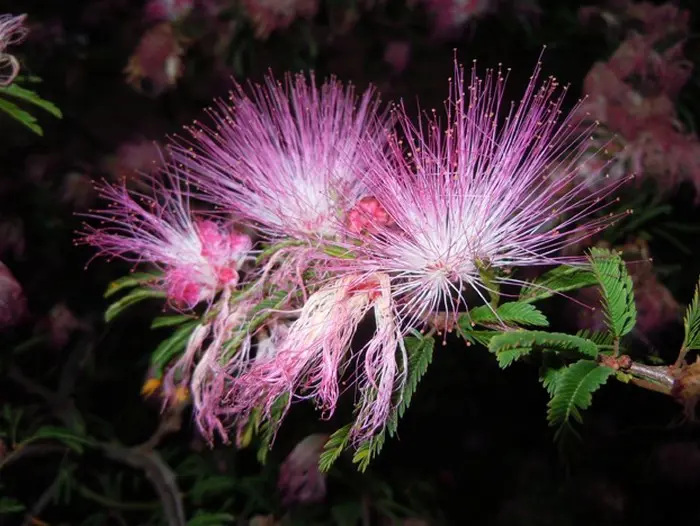 Die Blüten stechen durch die langen Staubblätter hervor. Dadurch sehen sie aus wie rosa oder rote Pinsel. Calliandra gehört zur Familie Mimosaceae mimosa (Unterfamilie der Leguminosae – Hülsenfrüchte). Zur Familie der Mimosa gehören außerdem die Albizia (persischer Schlafbaum), Akazie, Albizia (persischer Schlafbaum), Mimosa (Gewürz-rühr-mich-nicht) und Paraserianthes.