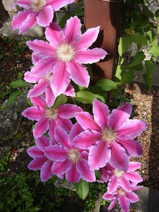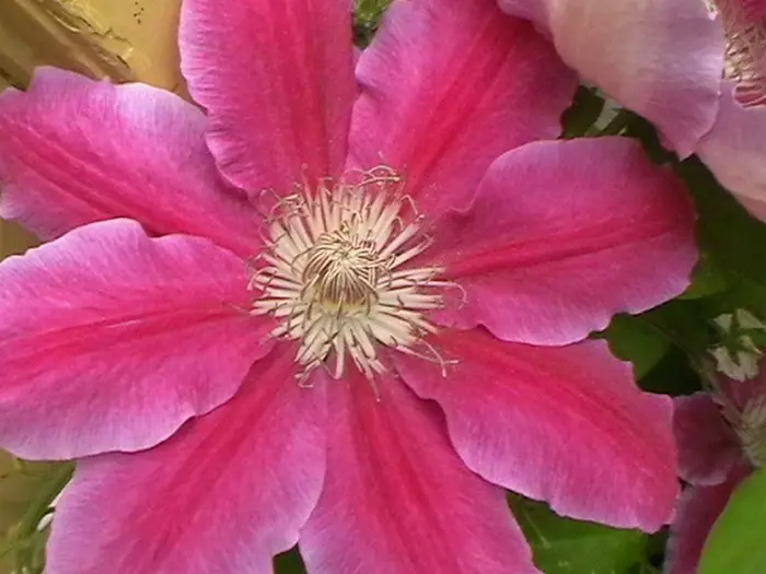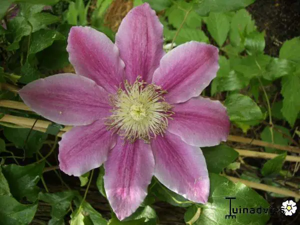 Clematis 'Dr. Ruppel' blüht mit weiß-rosa Blüten und einem breiten, leuchtend violetten Rosastreifen in der Mitte.