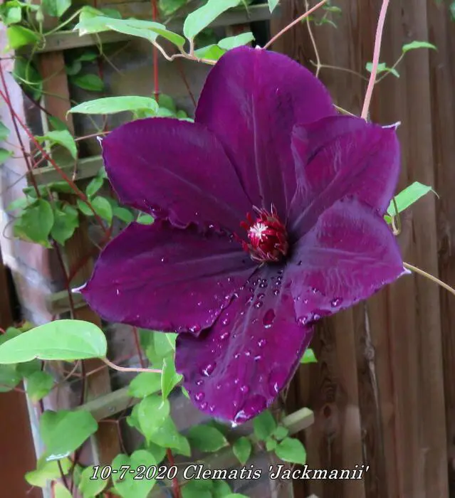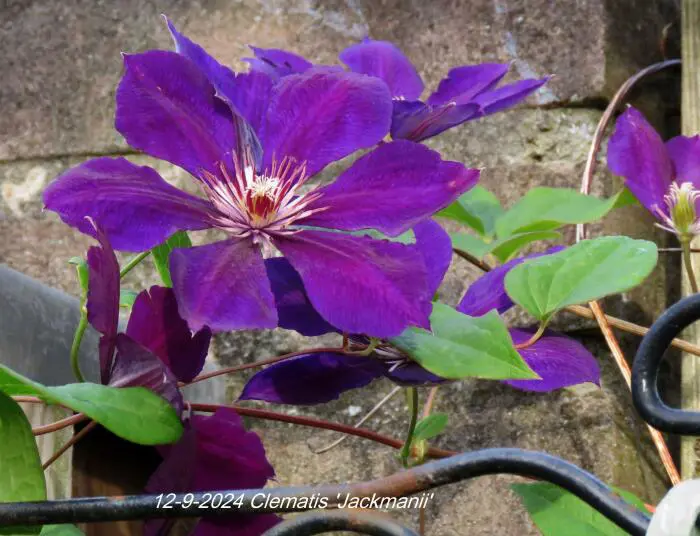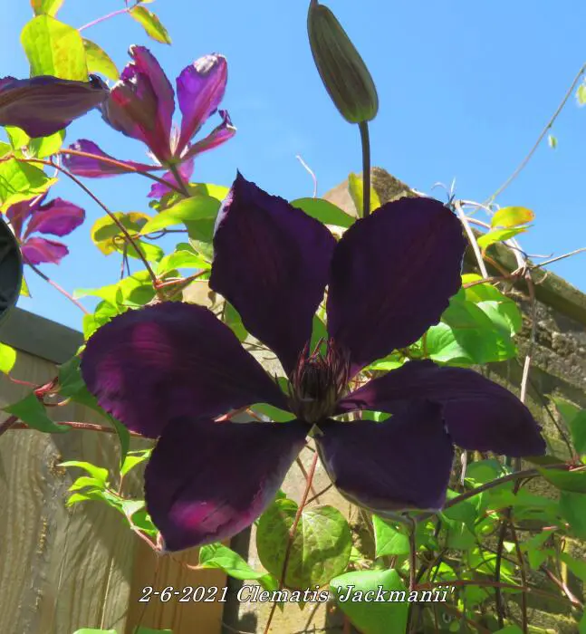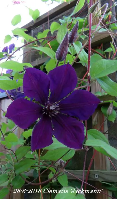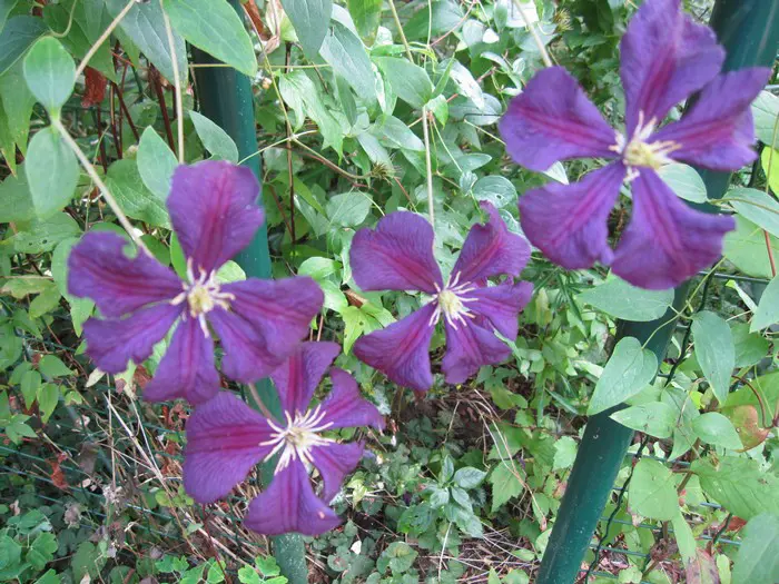 Clematis 'Jackmanii' hat samtig-violette Blüten mit gelben Staubblättern. In der Mitte der Blütenblätter ist die Farbe heller mit violett-roten Streifen.