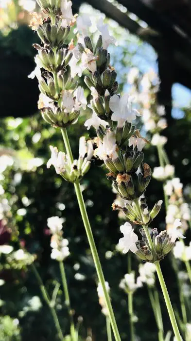 Lavandula angustifolia 'Alba' ist ein Halbstrauch, der häufig in Gärten verwendet wird, um Pflanzflächen aufzufüllen. Sie sind wunderschön graublättrig, mit weißen Blüten und mögen einen sonnigen Fleck, der im Winter nicht zu nass ist.