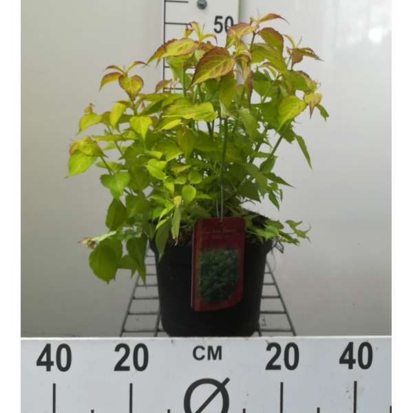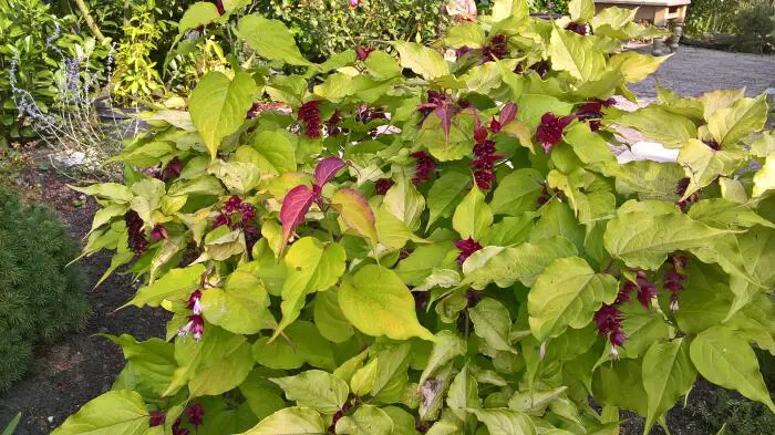 Ein exotischer Halbstrauch bildet einen buschigen, aufrecht wachsenden Strauch mit auffällig goldgelben Blättern.