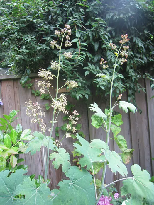 Macleaya cordata hat ein auffallend schönes graugrünes Blatt mit ebenso schöner, federförmiger weiß-rosa Blüte.