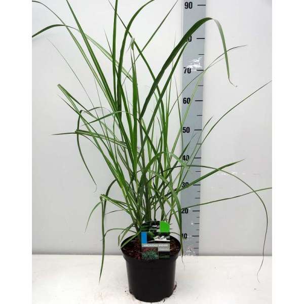 Miscanthus sinensis 'Malepartus' hat eine stark aufrechte Form. Die breiten Blätter haben eine weiße Mittelrippe und blühen im Spätsommer üppig mit kupferfarbenen Rispen.