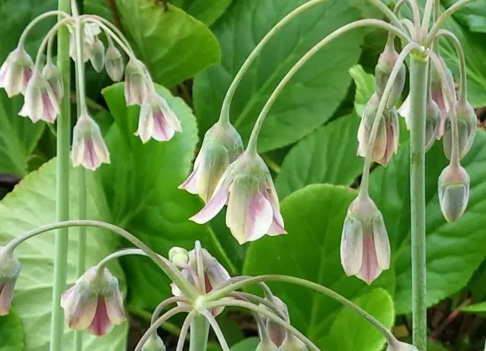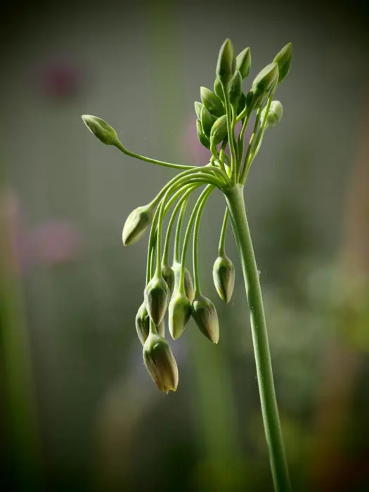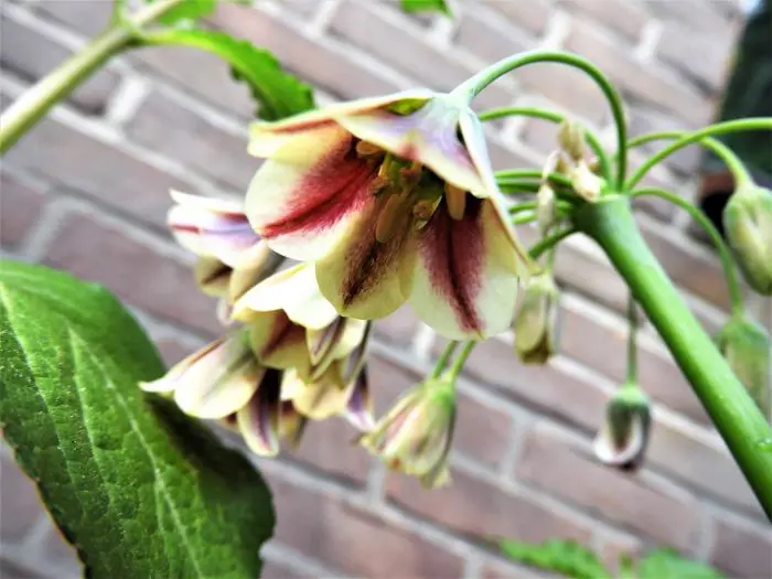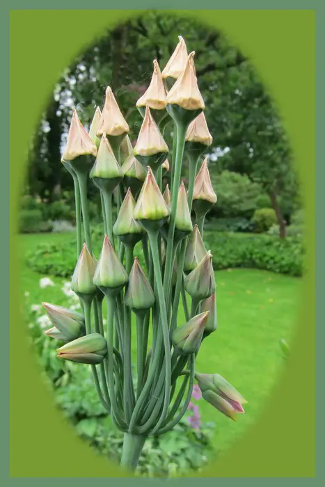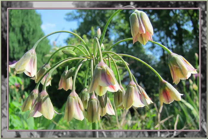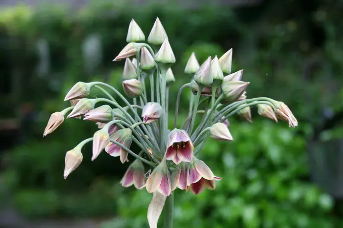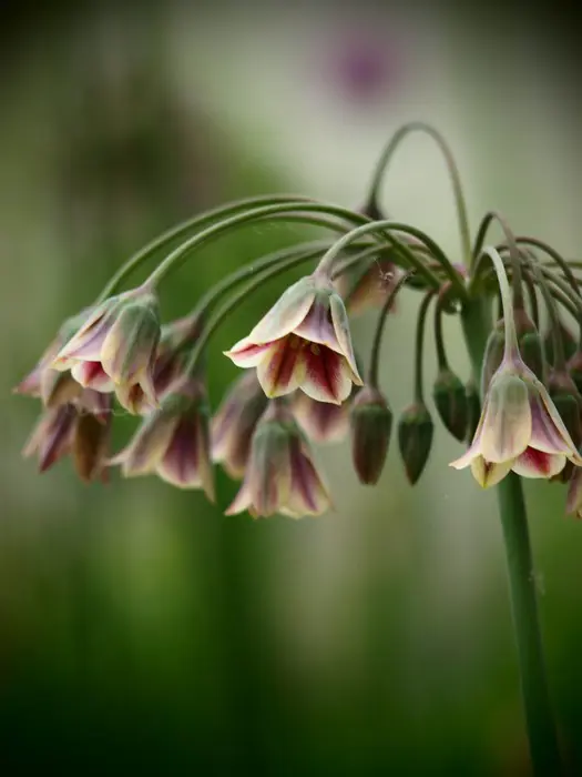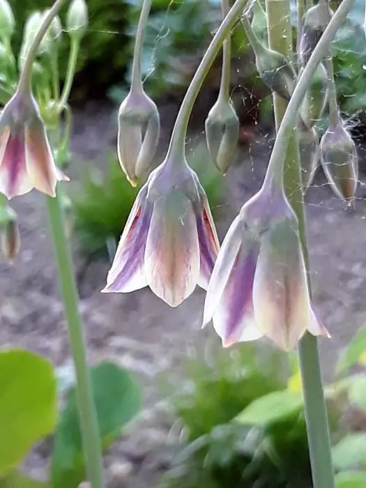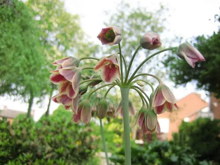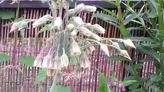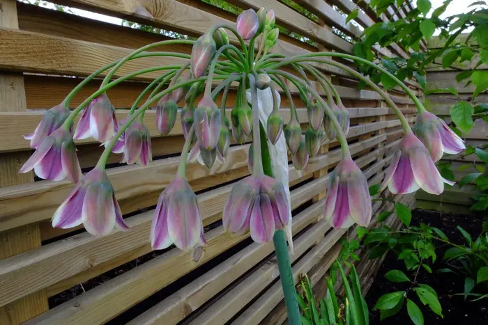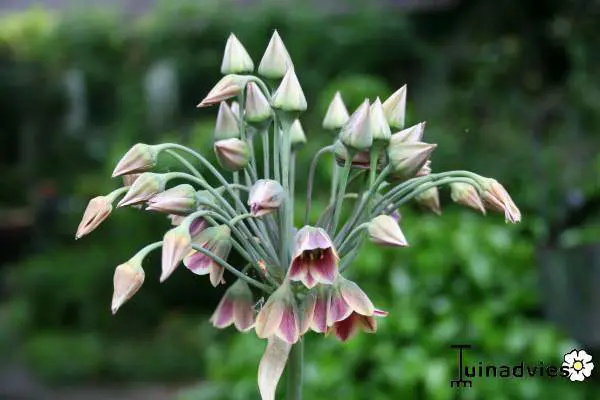 Es handelt sich um eine Blütenzwiebel, die sich mit fast jeder Pflanze im Beet verbindet, die bulgarische Zwiebel. Die Blüten bestehen aus Dutzenden von Glocken, die um den 90 cm hohen Stängel wie ein Karussell herumragen. Die Farbe ist unbeschreiblich schön. Die Außen- und Innenseite der Glocken haben einen cremefarbenen Farbton mit violetten und grünen Streifen. Diese Farben verbinden sich leicht mit anderen Blumentönen.