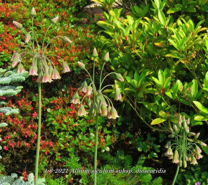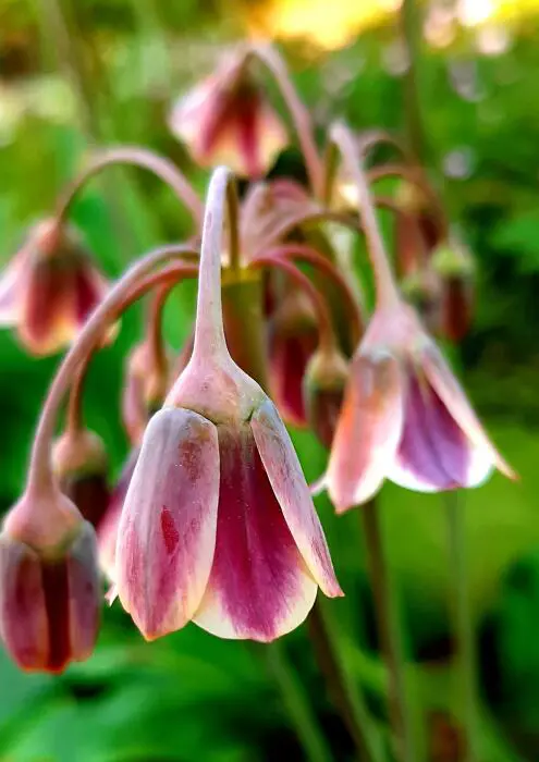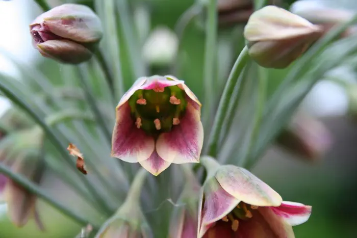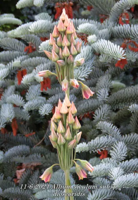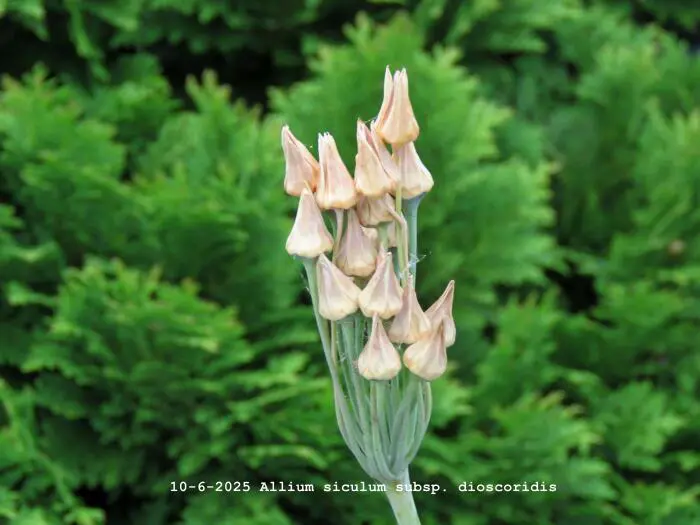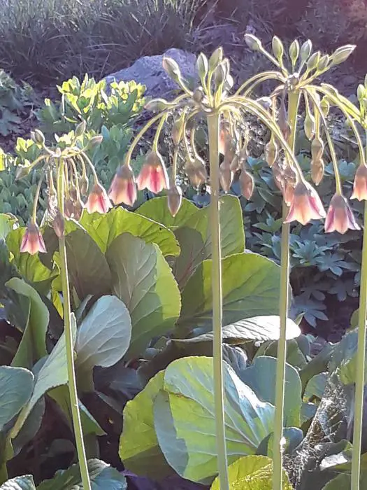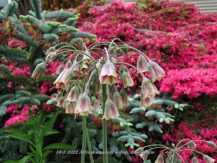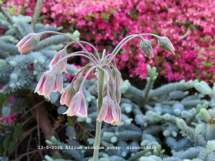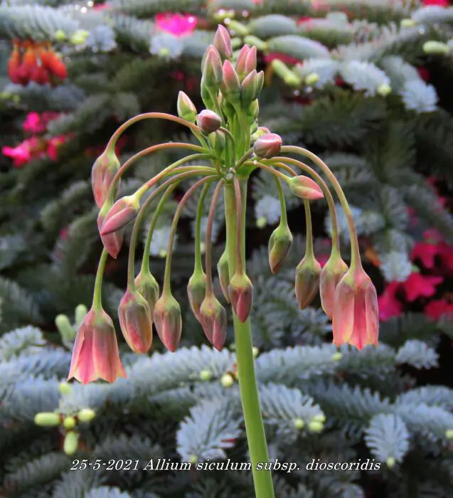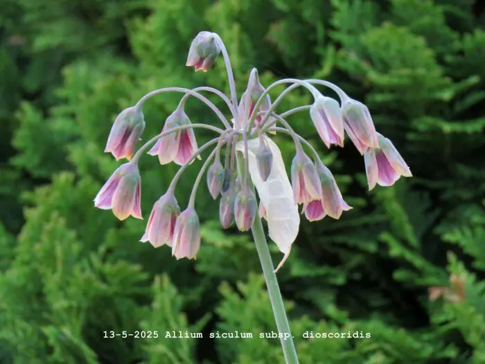 Es handelt sich um eine Blütenzwiebel, die sich mit fast jeder Pflanze im Beet verbindet, die bulgarische Zwiebel. Die Blüten bestehen aus Dutzenden von Glocken, die um den 90 cm hohen Stängel wie ein Karussell herumragen. Die Farbe ist unbeschreiblich schön. Die Außen- und Innenseite der Glocken haben einen cremefarbenen Farbton mit violetten und grünen Streifen. Diese Farben verbinden sich leicht mit anderen Blumentönen.