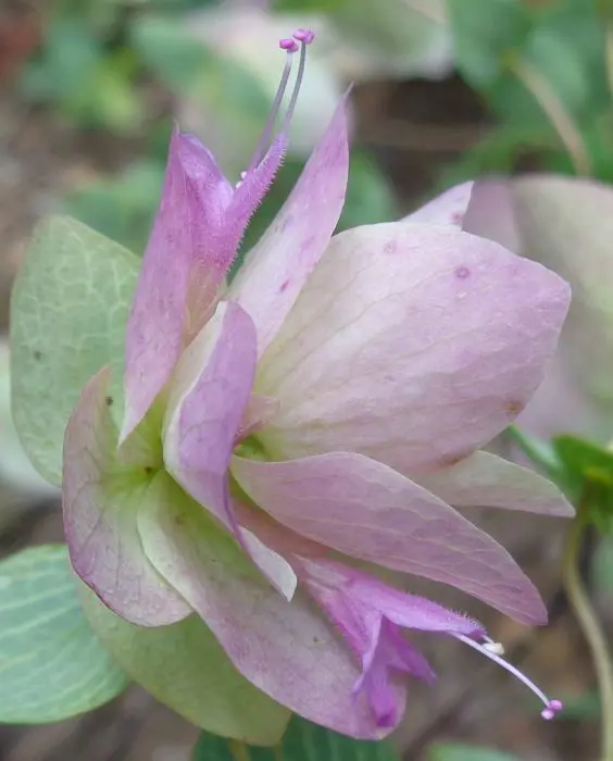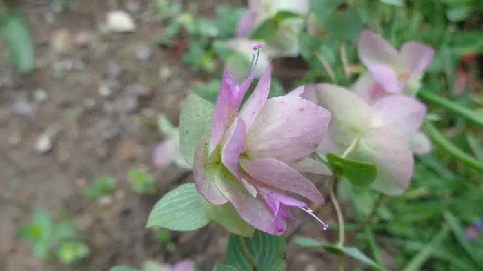 Diese Sorte ist besonders bemerkenswert für ihren hängenden Blütenstand. Bildet papierartige flieder-rosa Hochblätter mit lavendelblauen Blüten.